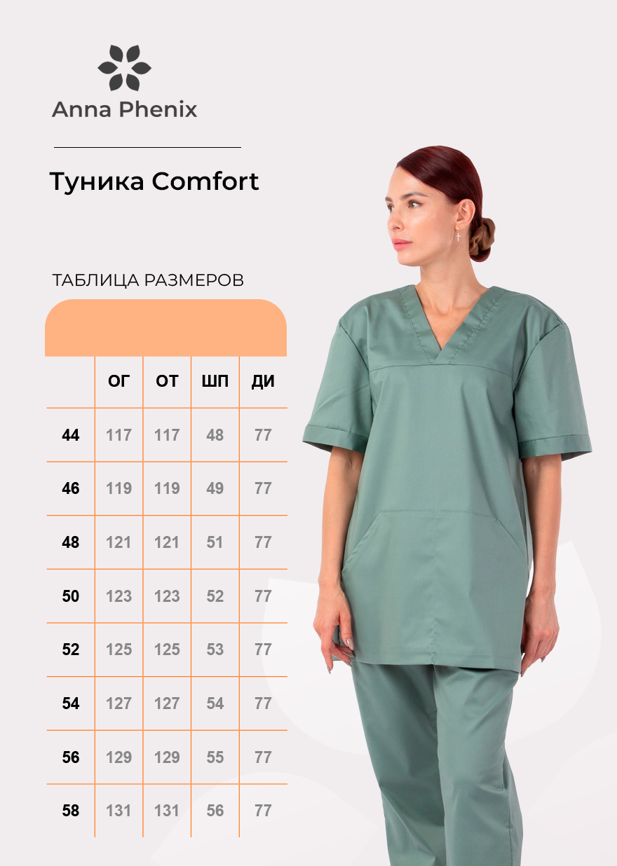 Медицинская женская туника выполнена в стиле унисекс, свободный крой модели сразу отсылает к функционалу этой спецодежды - в ней надо выполнять сложную работу, в том числе часами находиться в операционной. Этой задаче комфортная хирургичка соответствует на все сто: не сковывает движения в работе, сшита из гигроскопичной смесовой ткани с преобладанием хлопка, износостойка, а из объемного накладного кармана-кенгуру легко доставать медицинские инструменты и принадлежности. Удлиненная туника хорошо сочетается с брюками Comfort бренда Anna Phenix, образуя красивый медицинский костюм, а также с другими видами брюк. Медицинская женская туника или хирургичка представлена пятью цветовыми вариантами, стоит обратить внимание на широкий размерный ряд.