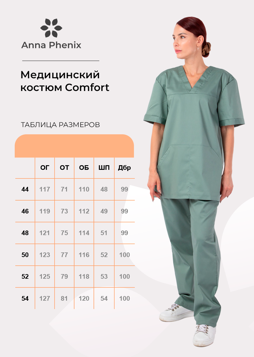 Хирургический костюм Comfort выполнен в стиле унисекс, аккуратно смотрится как на женщинах, так и на мужчинах. Удобный костюм, состоящий из просторной удлиненной туники и брюк, имеет свободный крой, не сковывает движения в работе, сшит из гигроскопичной смесовой непросвечивающей ткани с преобладанием хлопка, устойчив к частым стиркам, что важно для хирургической спецодежды. На хирургической тунике размещен вместительный накладной карман-кенгуру, в который легко под углом опустить ладони, карманами также снабжены брюки. Эту удобную модель бренда Anna Phenix можно отнести к классике жанра в спецодежде для медиков, только здесь вы можете выбрать не только белый хирургический костюм, цветовая гамма представлена еще четырьмя вариантами. Обратите внимание на широкий размерный ряд.
